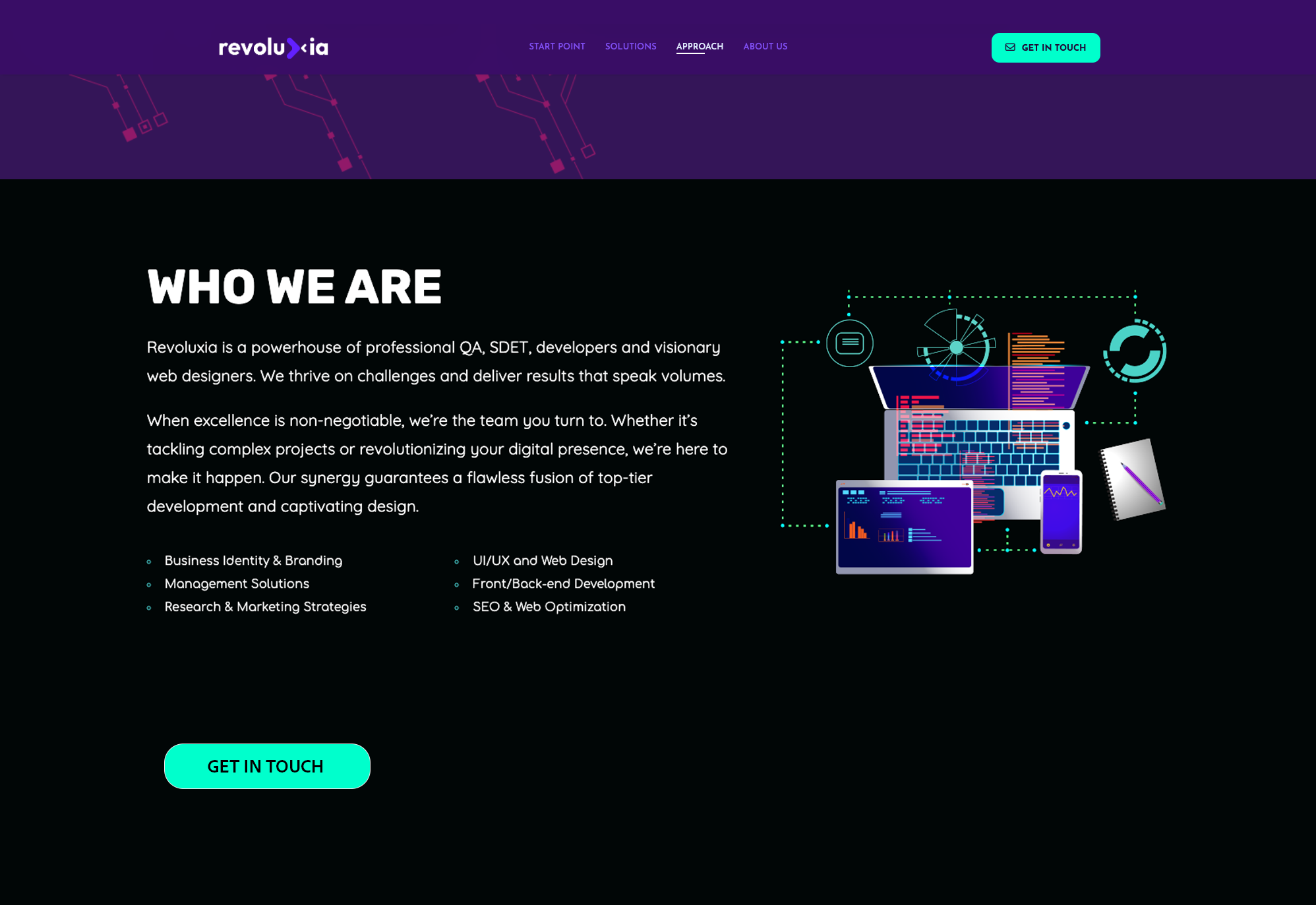 Revoluxia, eine Headhunting-Agentur, die sich darauf spezialisiert hat, Unternehmen mit Talenten in den Bereichen Entwicklung, QA-Tests und verwandten Bereichen zusammenzubringen, benötigte eine Landing Page, um ihren Ansatz zu präsentieren. Das Ziel war es, eine einfache, aber moderne Seite zu erstellen, die Leads sammelt und potenzielle Talente anzieht.